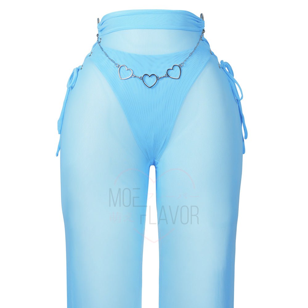 Embrace celestial charm with our Angel Blush Lingerie set. The top features an open design with sheer ribbon straps. The sheer pants boast ribbon-laced open sides and ruffled hems, complemented by a silver chain heart belt. Available in purple or blue, this set combines daring style with hidden comfort. Perfect for special moments, it's a heavenly choice that elevates your allure.