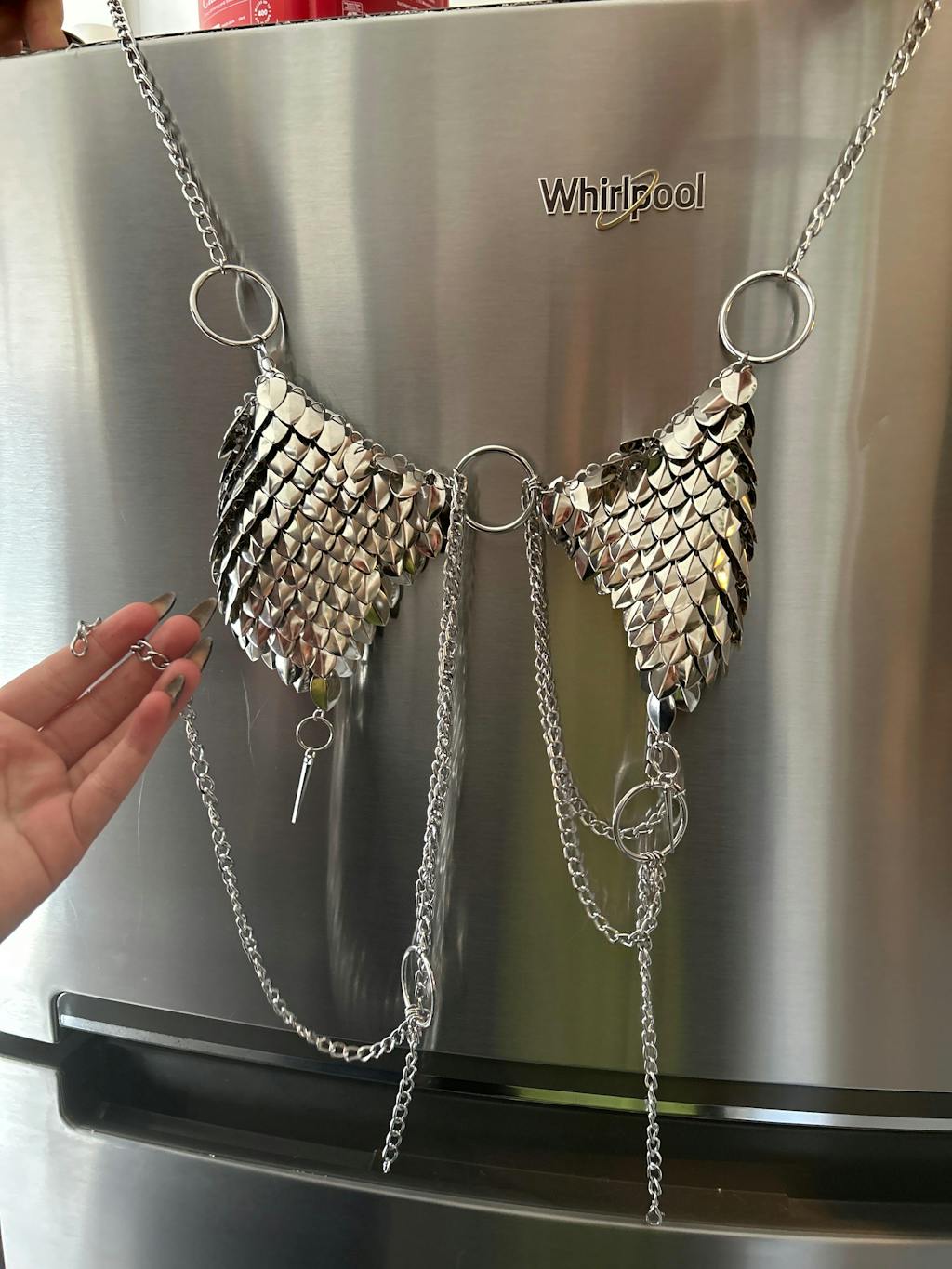 It’s beautiful, but very flimsy. The jump rings that have been used on the scale mail part of the top are extremely lightweight. I’ve done my best to be gentle with this set, but every time I try it on, at least one of the jump rings holding the top together pulls open, which makes me feel very paranoid about the whole thing falling apart. I wish the rings were heavier, or at least soldered together.