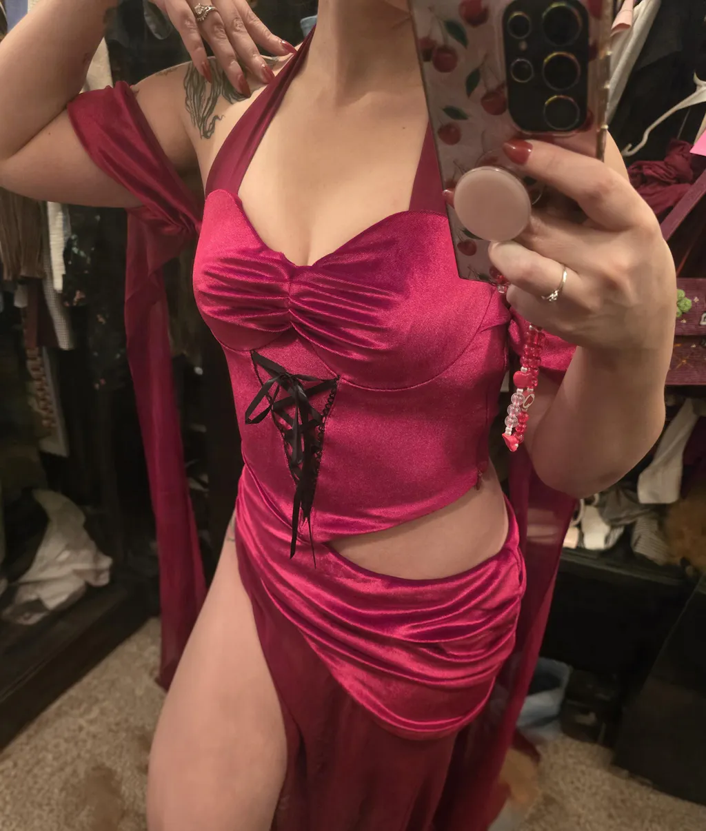 Paired with matching lace-up panties and long, elegant gloves, this outfit exudes a fierce yet alluring vibe.Ā