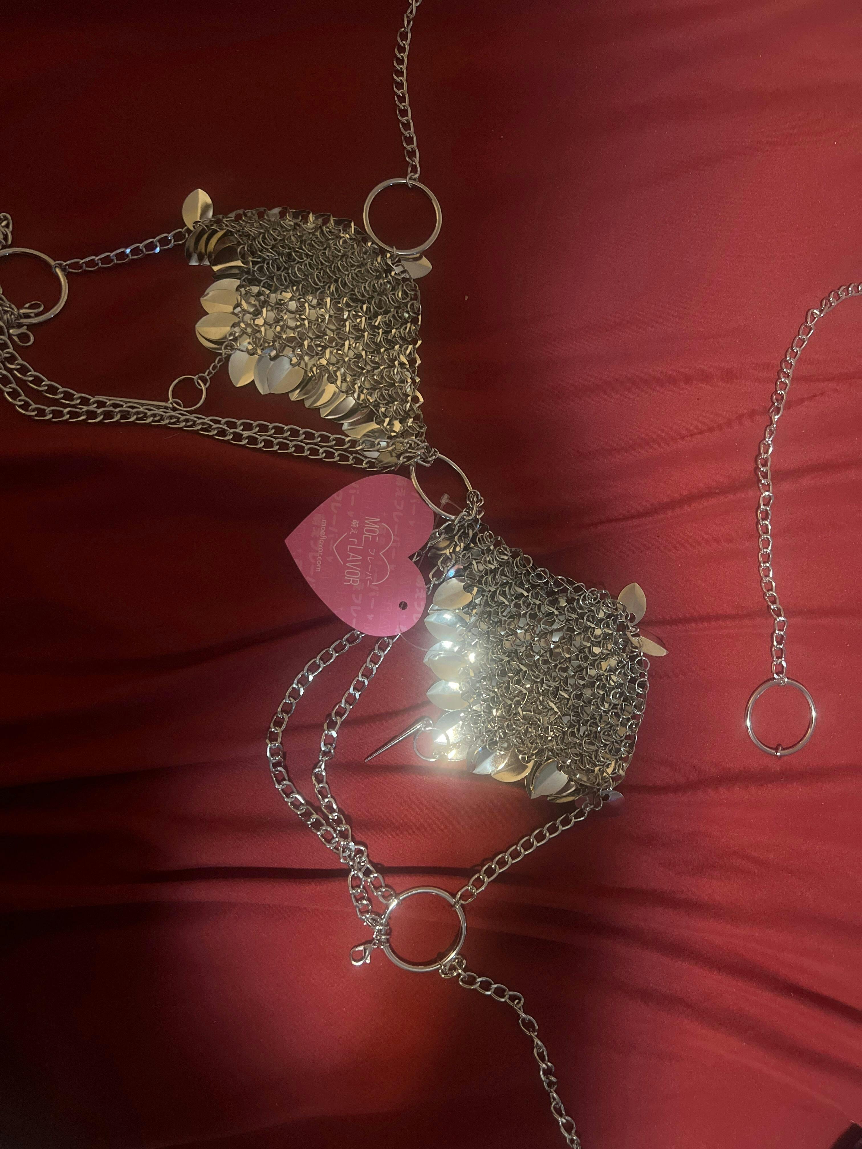 Step into your power and slay in style with our Iron Maiden Top / Skirt. Featuring sleek metal scales on top and a shimmering drape of silver rings for the bottoms, this outfit is equal parts warrior goddess and runway rebel. Designed for the bold and worn by the brave - this is the fantasy-core main event.